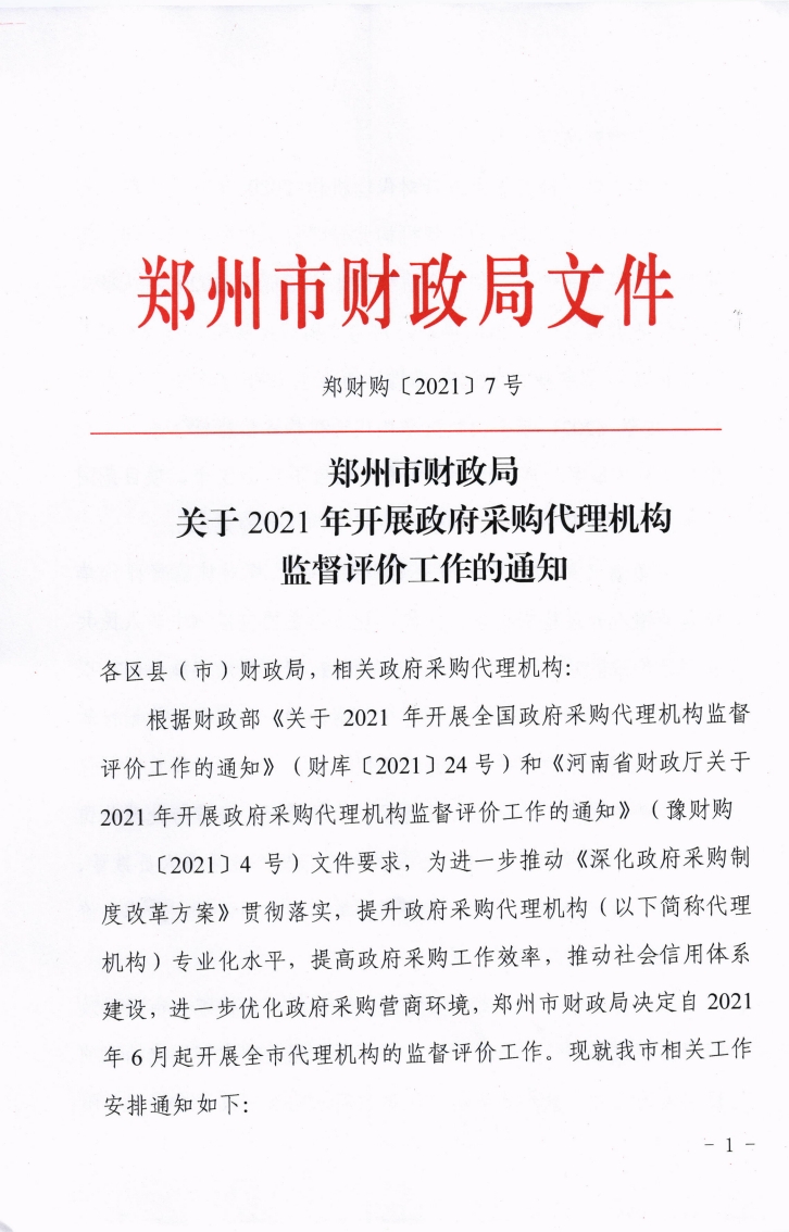 鄭州市財政局 關于2021年開展政府采購代理機構監(jiān)督評價工作的通知