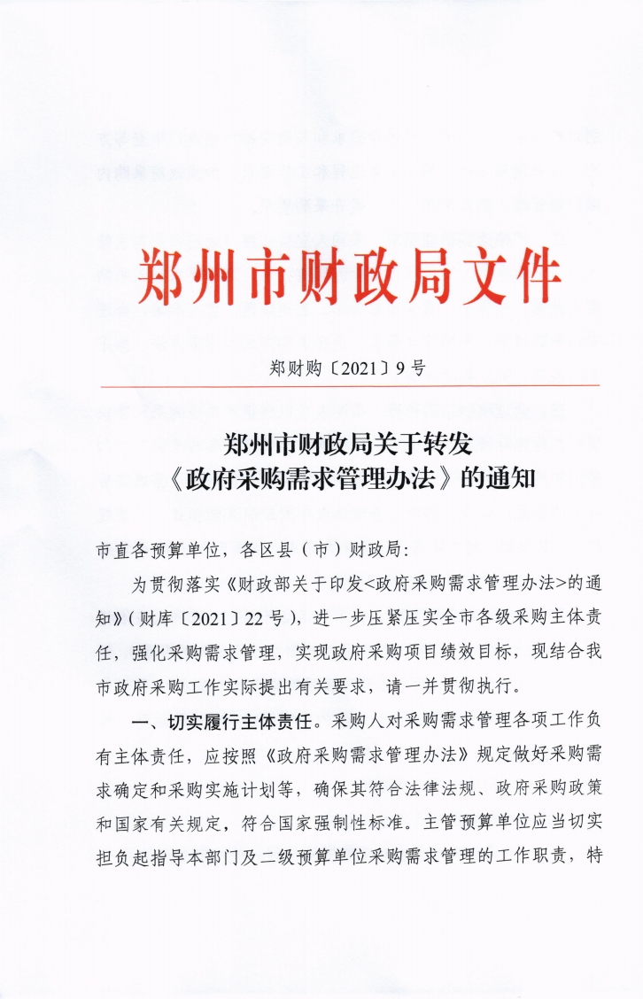 鄭州市財政局 關(guān)于轉(zhuǎn)發(fā)《政府采購需求管理辦法》的通知