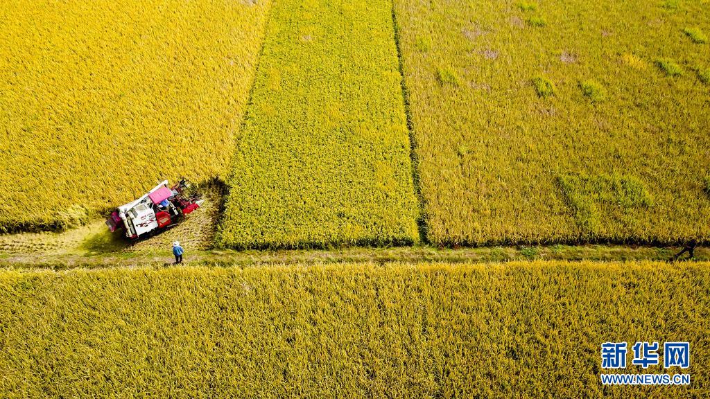 2020 年 10 月 21 日,在山東省棗莊市臺兒莊區(qū)邳莊鎮(zhèn),收割機在收獲水稻(無人機照片)。 新華社記者 郭緒雷 攝