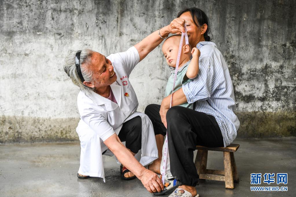 廣西賀州市鐘山縣兩安瑤族鄉(xiāng)竹梅村的鄉(xiāng)村醫(yī)生王秋姣(左)上門體檢時給小朋友測量身高(5月11日攝)。新華社記者 曹祎銘 攝