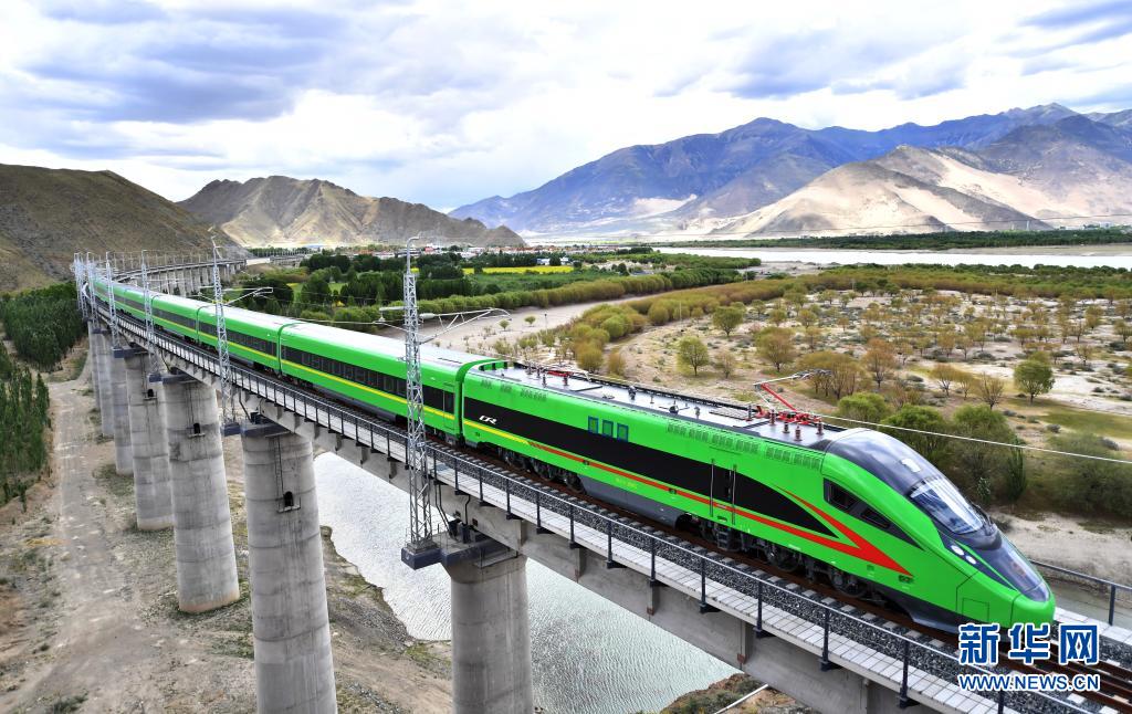 試運行的復興號列車行駛在西藏山南市境內(6月16日攝)。新華社記者 覺果 攝