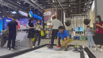 在奧地利展廳,一個(gè)小型冰壺場(chǎng)吸引眾人關(guān)注,不時(shí)有參觀者體驗(yàn)。
