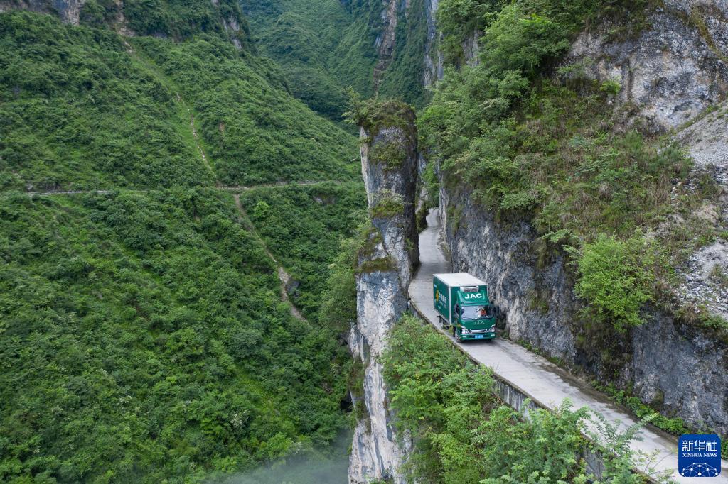 郵車行進在通往四川省漢源縣永利鄉(xiāng)古路村的山路上(6月23日攝,無人機照片)。新華社記者 江宏景 攝