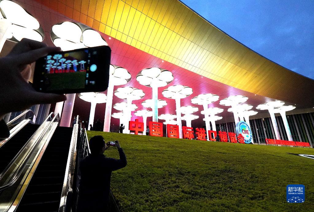 2018年11月4日,人們?cè)谂臄z國(guó)家會(huì)展中心(上海)場(chǎng)館夜景。2018年11月5日,首屆中國(guó)國(guó)際進(jìn)口博覽會(huì)在上海開幕。新華社記者 陳飛 攝