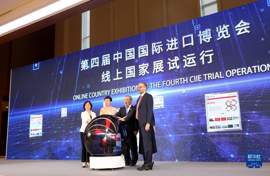10月13日,第四屆中國(guó)國(guó)際進(jìn)口博覽會(huì)線上國(guó)家展試運(yùn)行啟動(dòng)儀式在國(guó)家會(huì)展中心(上海)舉行。新華社記者 方喆 攝