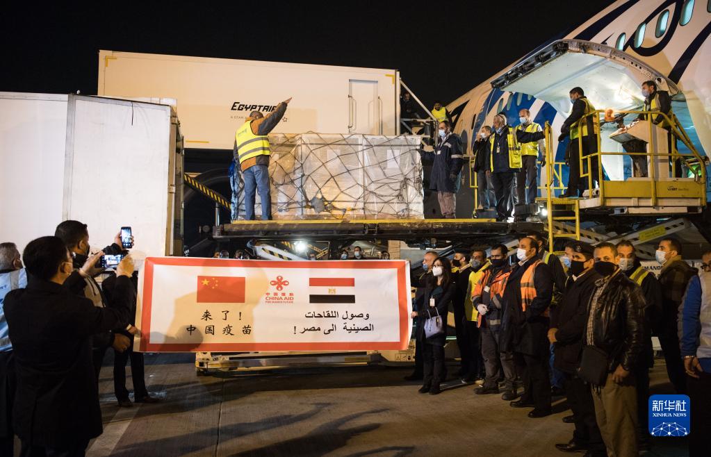 2月23日,在埃及開羅國際機(jī)場,工作人員運(yùn)輸疫苗。中國援助埃及的首批新冠疫苗當(dāng)日凌晨運(yùn)抵開羅,援助阿盟秘書處的新冠疫苗也同機(jī)抵達(dá)。新華社記者 鄔惠我 攝