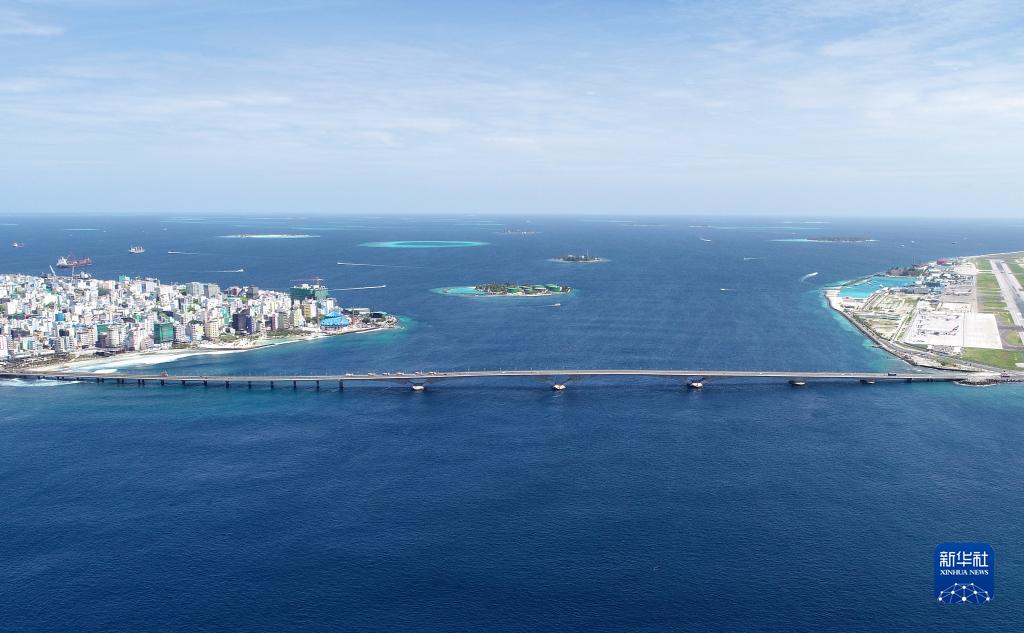 這是2019年8月30日拍攝的由中國援建的馬爾代夫中馬友誼大橋(無人機(jī)照片)。新華社發(fā)(王明亮攝)