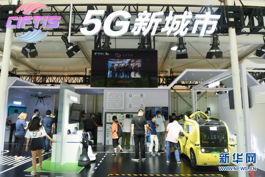9 月 7 日,觀眾在 2020 年中國國際服務貿易交易會 5G 通信服務專題展區(qū)參觀。 2020 年中國國際服務貿易交易會 9 月 4 日至 9 日在北京舉行。新華社記者 魯鵬 攝