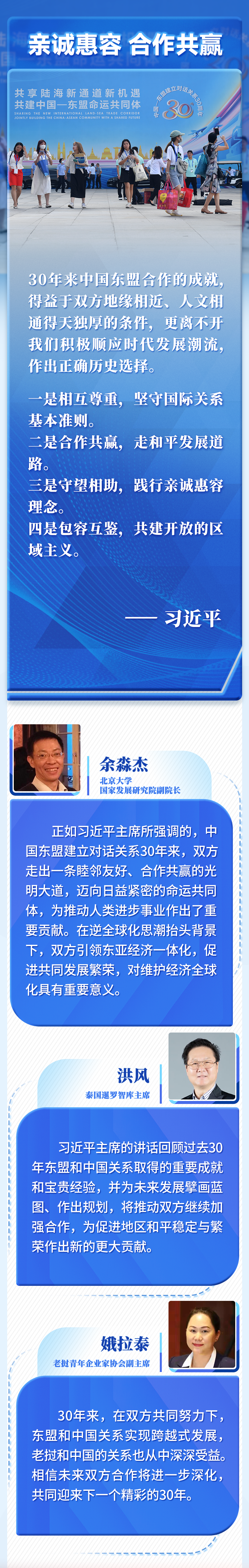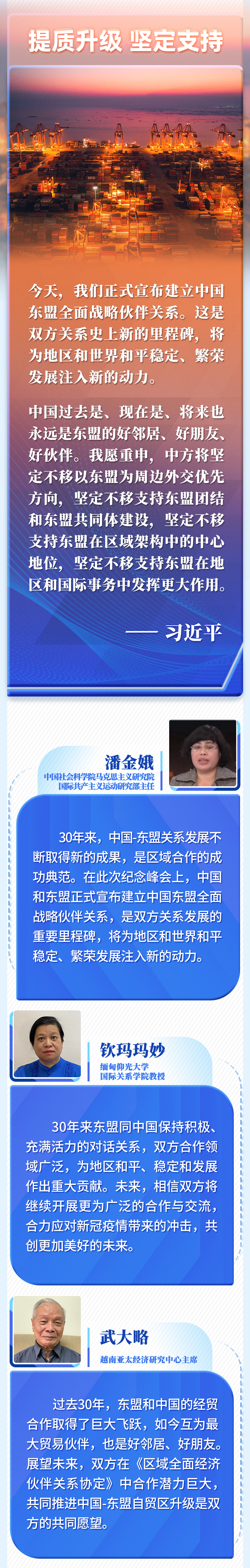 30年的寶貴經(jīng)驗是中國和東盟的共同財富,為雙方發(fā)展全面戰(zhàn)略伙伴關(guān)系奠定了基礎(chǔ)、提供了遵循。我們要倍加珍惜、長久堅持,并在新的實踐中不斷豐富和發(fā)展。