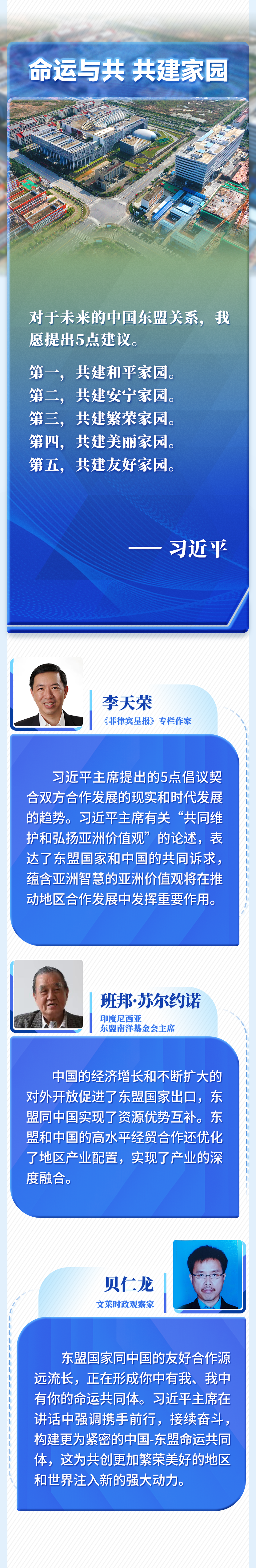 中國古人說:“謀度于義者必得,事因于民者必成?!弊屛覀儼讶嗣駥γ篮蒙畹南蛲旁谛念^,把維護(hù)和平、促進(jìn)發(fā)展的時代使命扛在肩上,攜手前行,接續(xù)奮斗,構(gòu)建更為緊密的中國-東盟命運共同體,共創(chuàng)更加繁榮美好的地區(qū)和世界!