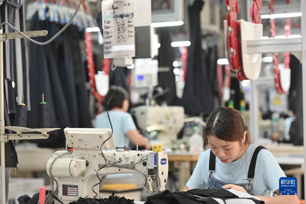 在位于福建省泉州市經(jīng)濟(jì)技術(shù)開發(fā)區(qū)的九牧王西褲智能化生產(chǎn)車間,工人在自動化西褲吊掛流水線上作業(yè)(7月30日攝)。新華社記者 宋為偉 攝