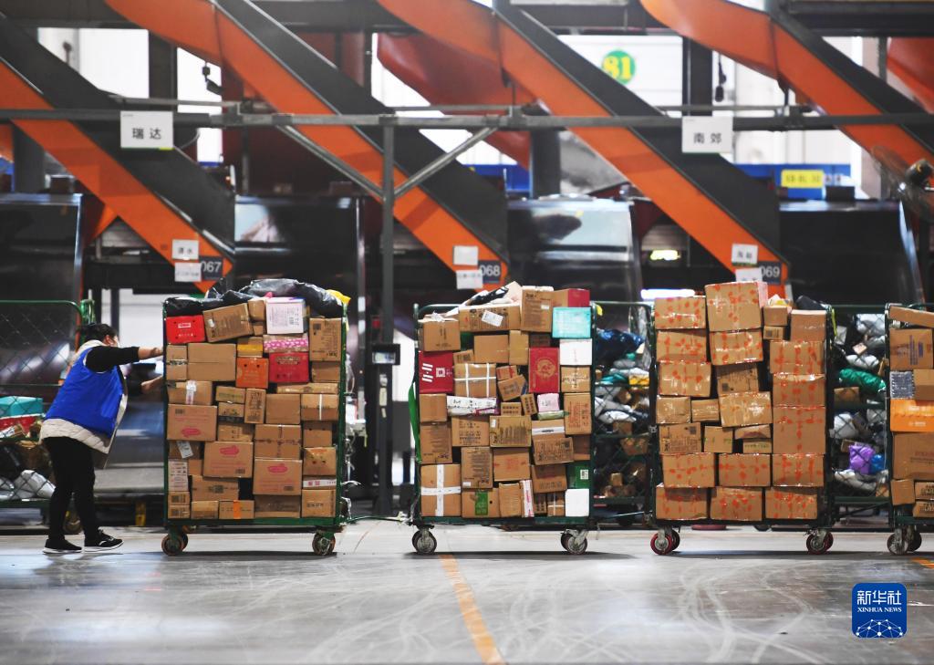 在中國郵政集團有限公司河南省鄭州郵區(qū)中心,工作人員在轉(zhuǎn)移快遞包裹(11月11日攝)。新華社記者 張浩然 攝