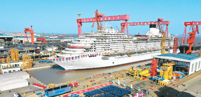 日前,中國(guó)首制大型郵輪在中國(guó)船舶集團(tuán)旗下上海外高橋造船有限公司船塢內(nèi)順利實(shí)現(xiàn)塢內(nèi)起浮。這是大型郵輪建造的重要節(jié)點(diǎn),標(biāo)志著該項(xiàng)目向著完工交付的總目標(biāo)邁出關(guān)鍵一步。去年末,中國(guó)船舶集團(tuán)總部由北京遷往上海。本報(bào)記者 沈文敏攝