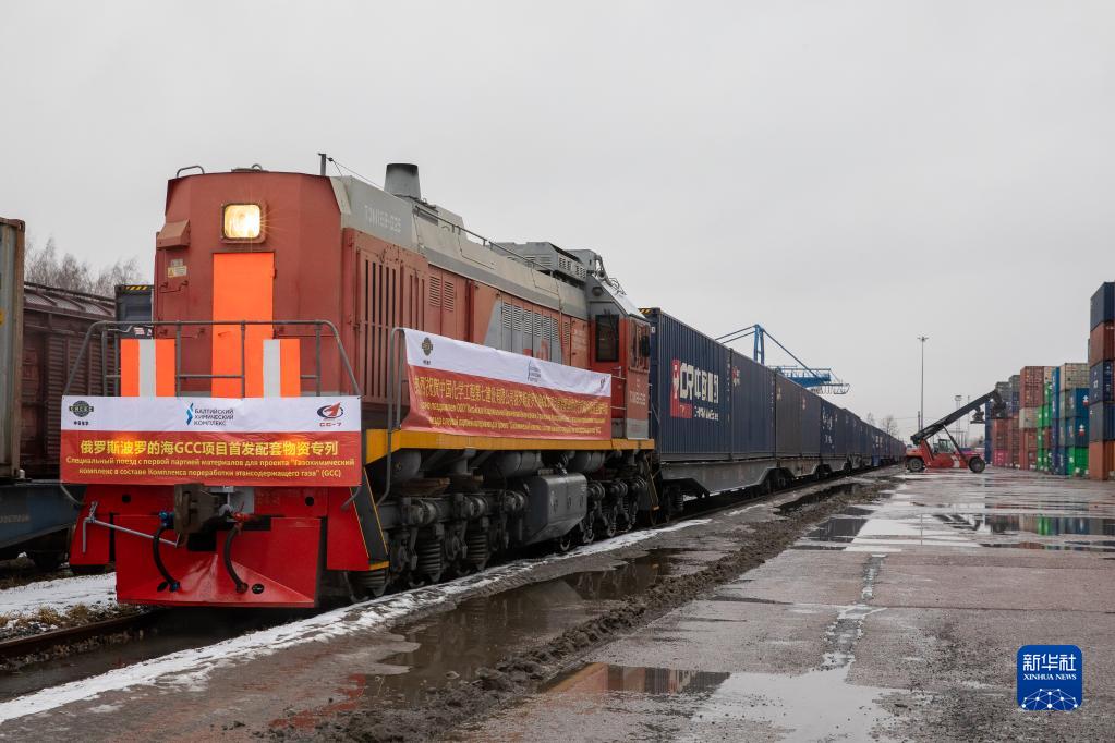 2021年3月15日,由中國(guó)成都首發(fā)至俄羅斯圣彼得堡市的中歐班列抵達(dá)俄羅斯圣彼得堡舒沙雷火車站。新華社發(fā)(俄羅斯鐵路公司十月鐵路局供圖)