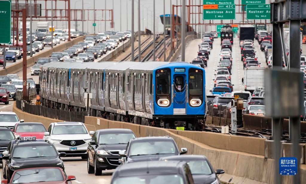 2021年5月6日,掛有7000系列車廂的地鐵列車在美國(guó)芝加哥載客試運(yùn)行。7000系列地鐵車廂由中國(guó)中車青島四方機(jī)車車輛股份有限公司(中車四方)在美國(guó)制造組裝。新華社發(fā)(喬爾·萊納 攝)
