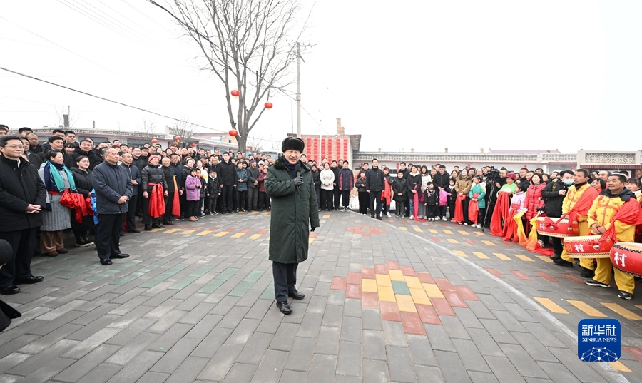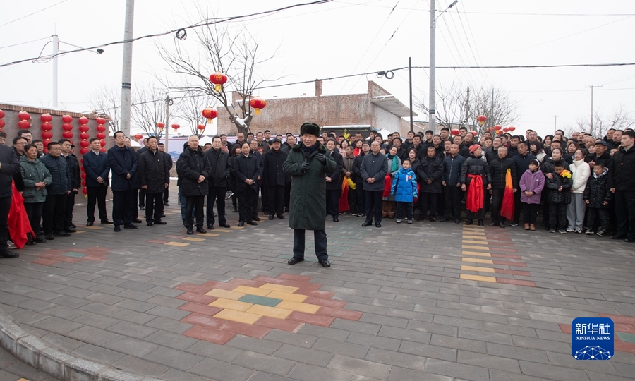 村文化廣場(chǎng)上十分熱鬧,村民們打起威風(fēng)鑼鼓、扭起秧歌歡慶佳節(jié)??吹娇倳泚砹?,人們高興地歡呼起來。習(xí)近平對(duì)鄉(xiāng)親們說,我們黨的根本宗旨就是為人民群眾辦好事,為人民群眾幸福生活拼搏、奉獻(xiàn)、服務(wù)。我們?nèi)缙诖蜈A了脫貧攻堅(jiān)戰(zhàn),如期實(shí)現(xiàn)了全面建成小康社會(huì)目標(biāo),現(xiàn)在踏上了全面建設(shè)社會(huì)主義現(xiàn)代化國家新征程。建設(shè)現(xiàn)代化國家離不開農(nóng)業(yè)農(nóng)村現(xiàn)代化,要繼續(xù)鞏固脫貧攻堅(jiān)成果,扎實(shí)推進(jìn)鄉(xiāng)村振興,讓群眾生活更上一層樓,在推進(jìn)農(nóng)業(yè)農(nóng)村現(xiàn)代化中越走越有奔頭。