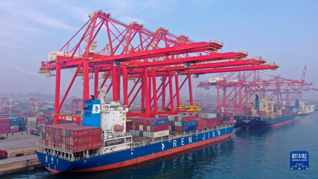 1月26日,貨輪??吭谏綎|日照港集裝箱碼頭進行裝卸作業(yè)(無人機照片)。新華社記者 郭緒雷 攝