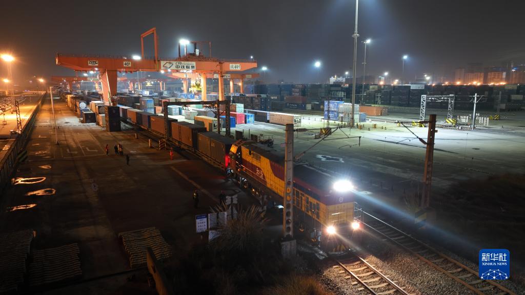 這是1月28日晚在成都拍攝的中歐班列(無人機照片)。新華社發(fā)(白桂斌 攝)