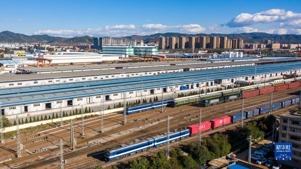 1月1日,滿載30個標(biāo)準集裝箱的中老鐵路新年首趟國際貨物列車(前)從昆明開往老撾萬象(無人機照片)。新華社記者 胡超 攝