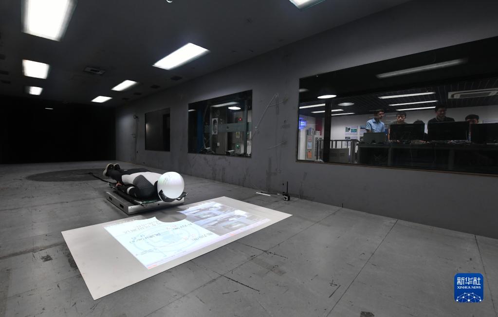 北京交通大學風洞實驗室研究團隊成員通過風洞輔助訓練系統(tǒng)進行風洞測試。該系統(tǒng)能夠應用于冰雪項目運動姿態(tài)優(yōu)化、強化訓練及高性能運動裝備研發(fā)(2021年7月16日攝)。新華社記者 任超 攝