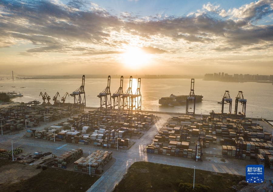 這是2021年12月5日清晨在海南洋浦經(jīng)濟(jì)開發(fā)區(qū)拍攝的海南自貿(mào)港建設(shè)重要的集裝箱航運樞紐——洋浦國際集裝箱碼頭(無人機(jī)照片)。新華社記者 蒲曉旭 攝