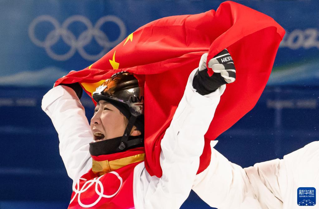 2月14日,中國(guó)選手徐夢(mèng)桃在比賽后慶祝。當(dāng)日,北京2022年冬奧會(huì)自由式滑雪女子空中技巧決賽在張家口云頂滑雪公園舉行,中國(guó)選手徐夢(mèng)桃奪得冠軍。新華社記者 肖藝九 攝
