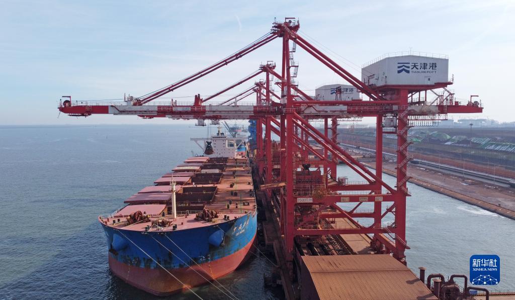 在天津港南疆港區(qū)26泊位,卸船機在進行卸貨作業(yè)(1月28日攝,無人機照片)。新華社記者 趙子碩 攝
