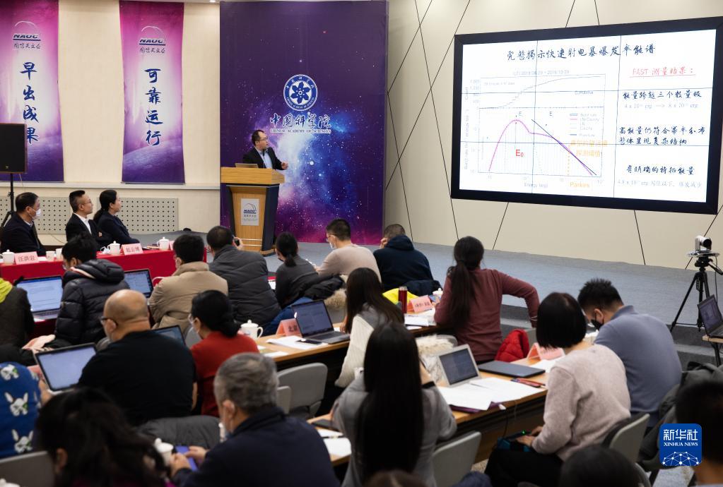 1月5日,在中科院國家天文臺舉行的新聞發(fā)布會上,國家天文臺王培在介紹FAST在快速射電暴領(lǐng)域的重大成果。新華社記者 金立旺 攝
