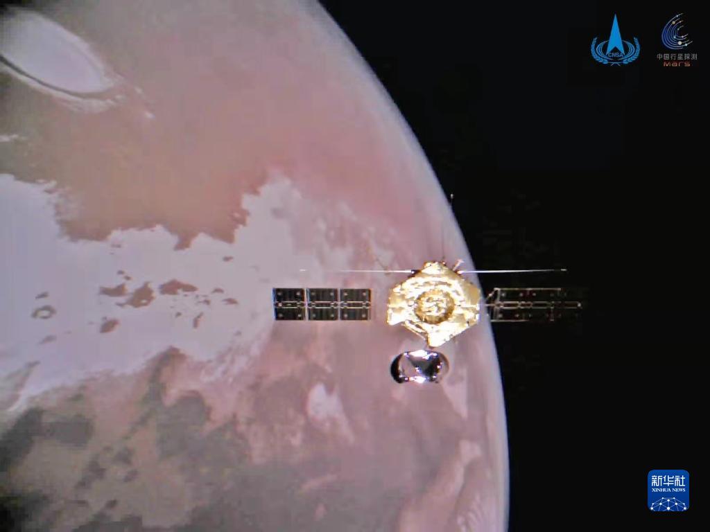 2022年元旦,國家航天局發(fā)布我國首次火星探測任務(wù)天問一號探測器從遙遠(yuǎn)火星傳回的一組精美圖像,向全國人民報告平安。這是環(huán)繞器與火星合影。新華社發(fā)(國家航天局供圖)