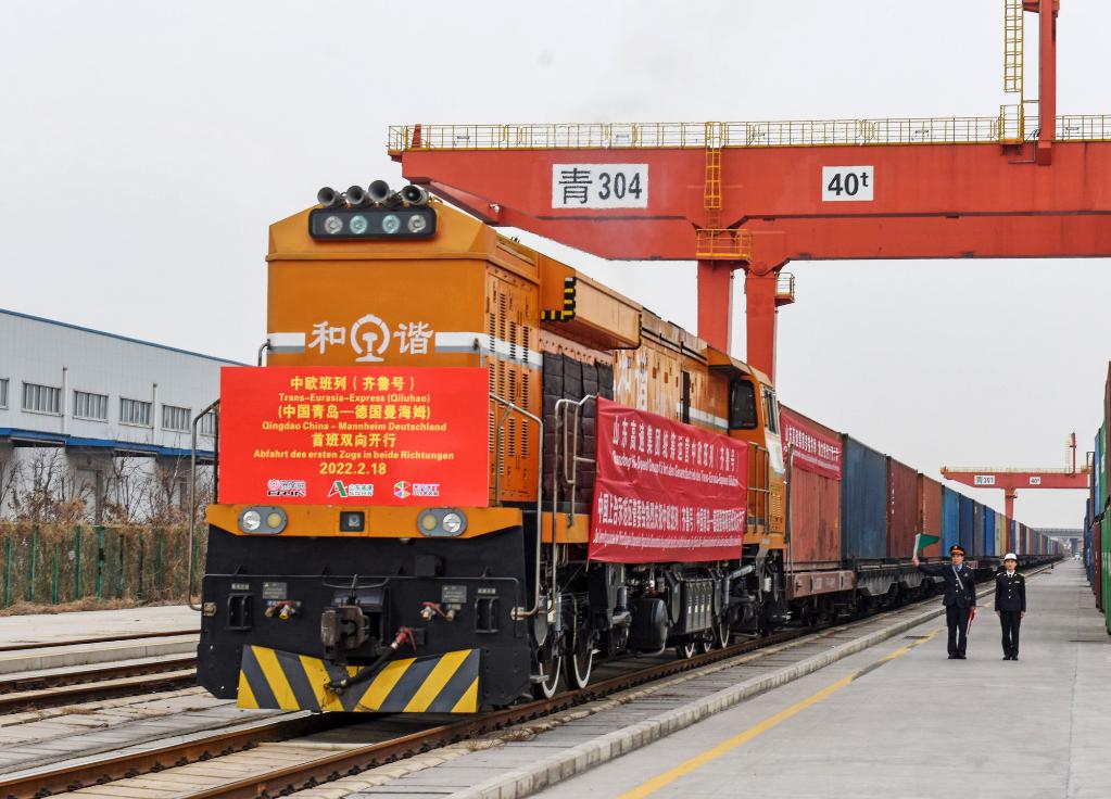 2月18日,中歐班列(齊魯號)中國青島—德國曼海姆雙向?qū)﹂_首班列車從上合示范區(qū)青島多式聯(lián)運中心出發(fā)。(新華社發(fā),王昭脈攝)
