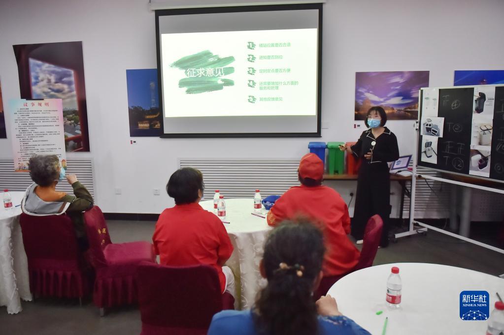 在北京建國門街道趙家樓社區(qū)議事廳舉行的“兩桶一袋”居民征求意見懇談會上,來自社區(qū)的12位垃圾分類達(dá)人對“兩桶”款式進(jìn)行投票選擇,同時,街道針對桶站位置、定時定點投放等垃圾分類運營管理聽取居民意見(2020年5月2日攝)。新華社記者 彭子洋 攝