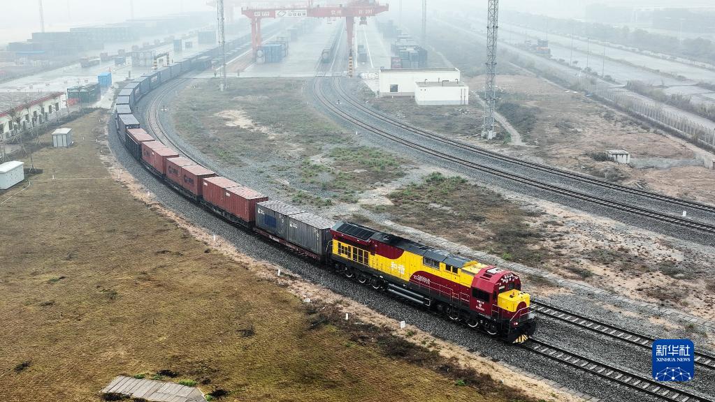 2022年1月15日,廣西新年首趟西部陸海新通道年貨班列從欽州港東站駛出(無(wú)人機(jī)照片)。新華社記者 張愛(ài)林 攝