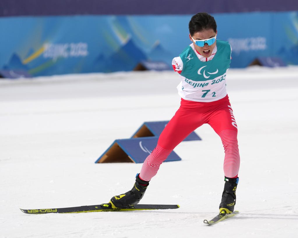 3月13日,中國隊(duì)選手王晨陽在北京冬殘奧會(huì)殘奧越野滑雪混合接力4×2.5公里比賽中。新華社記者 萬象 攝