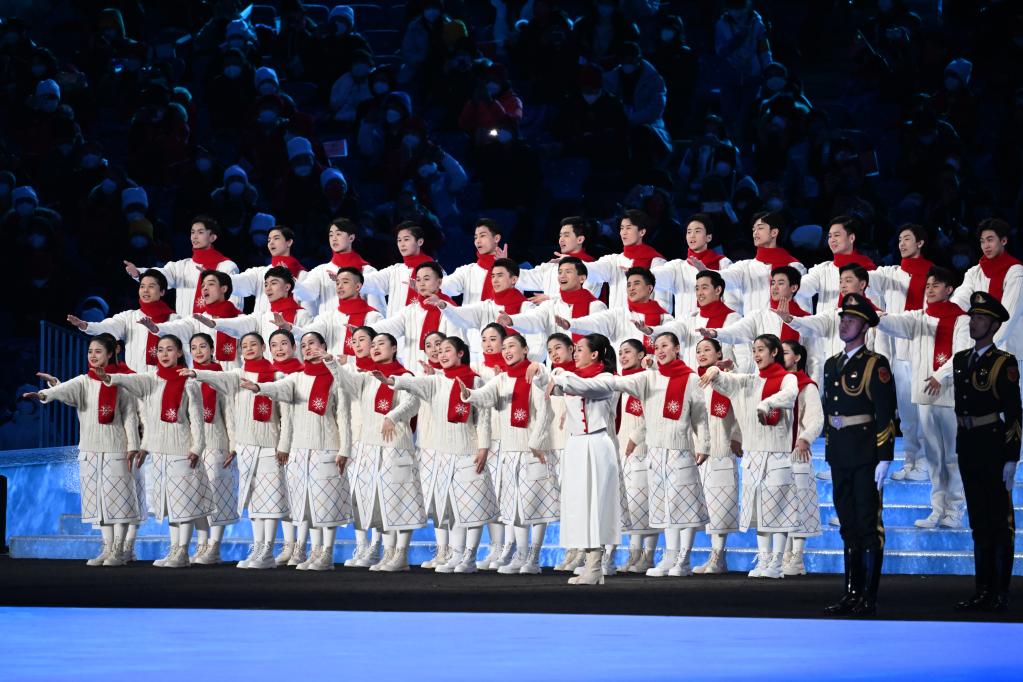 2022年3月4日晚,北京冬殘奧會(huì)開幕式上,中國殘疾人藝術(shù)團(tuán)團(tuán)長邰麗華帶領(lǐng)數(shù)十名殘疾人表演者用手語“唱”國歌。