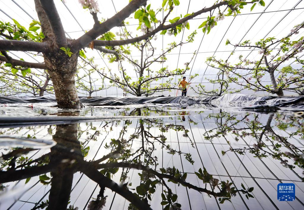 2022年1月11日,河北省灤州市茨榆坨鎮(zhèn)建民種植專業(yè)合作社的一名社員在大棚內給櫻桃樹澆水。新華社記者 楊世堯 攝