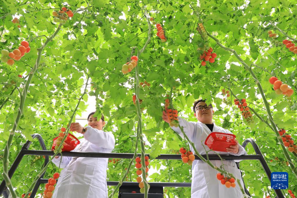 2022年2月18日,湖南省東安縣華維節(jié)水公司智慧農業(yè)大棚內,員工們采摘圣女果準備上市。新華社發(fā)(嚴潔攝)