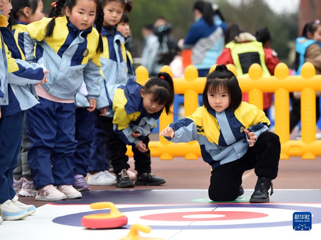 2月16日,安徽省合肥市泰山路幼兒園的小朋友在開學典禮上體驗“旱地冰壺”游戲。新華社記者 周牧 攝
