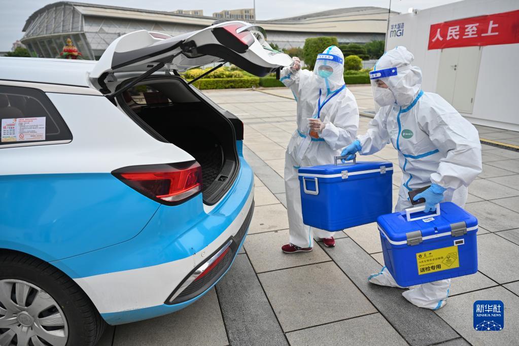 3月24日,在福建泉州市海峽體育中心聯(lián)合方艙核酸檢測基地,參加“抗疫志愿車隊(duì)”的出租車司機(jī)(左)協(xié)助醫(yī)務(wù)人員裝運(yùn)核酸檢測樣本。新華社發(fā)(周義攝)