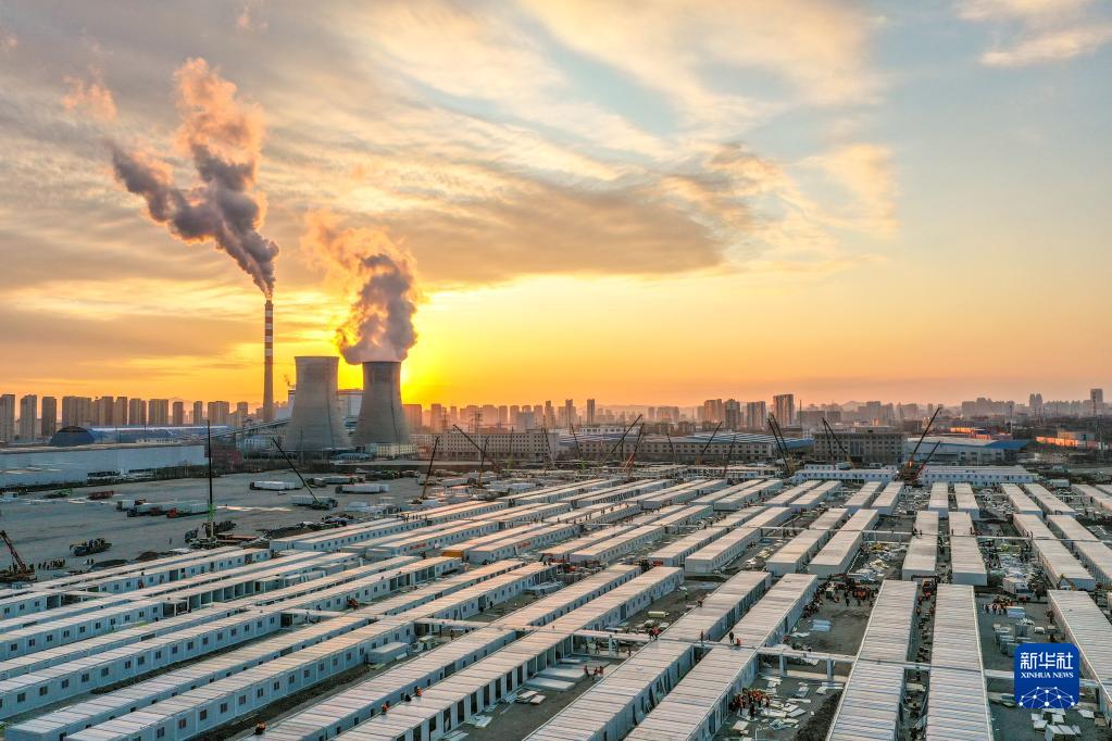 這是3月20日傍晚拍攝的吉林市高新南區(qū)隔離方艙建設(shè)現(xiàn)場(無人機(jī)照片)。新華社記者 張楠 攝