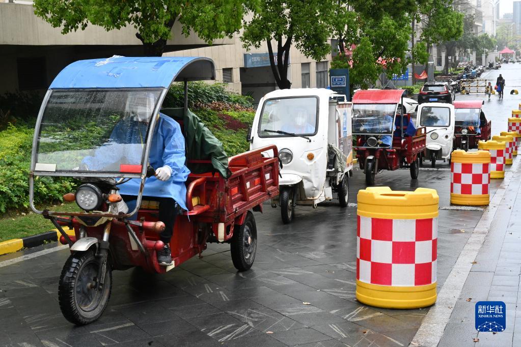 4月7日,在長沙市雨花區(qū)東塘街道楓樹山社區(qū),志愿者在卸載生活物資。新華社記者 陳思汗 攝
