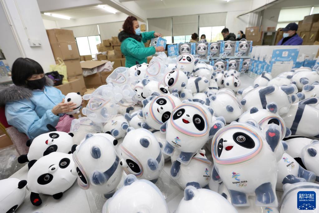 2月8日,工人在位于江蘇省啟東市的一家特許生產(chǎn)商的車間里包裝“冰墩墩”。新華社發(fā)(許叢軍 攝)