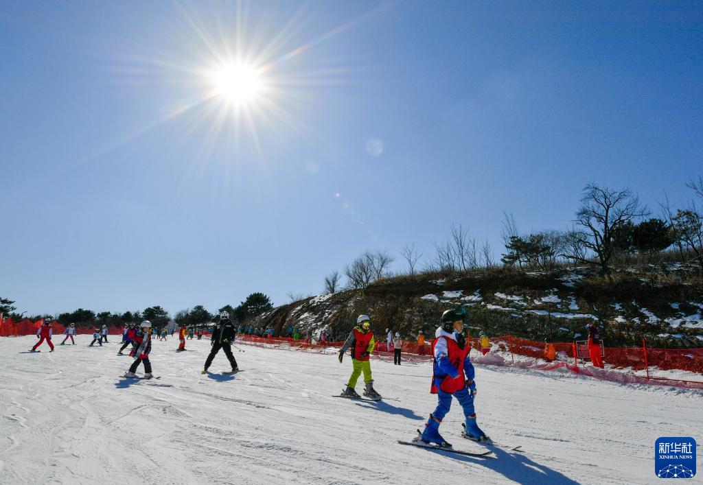 在天津薊洲國際滑雪場(chǎng),教練與小朋友在雪道上練習(xí)滑雪(2月20日攝)。新華社記者 孫凡越 攝