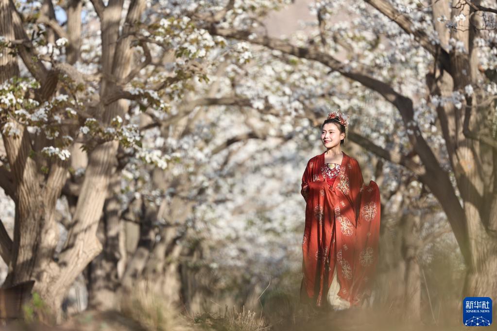 4月7日,景區(qū)工作人員在甘肅省蘭州市皋蘭縣什川鎮(zhèn)百年梨園內(nèi)進(jìn)行表演。受疫情影響,景區(qū)組織工作人員在梨園內(nèi)直播,邀請(qǐng)人們“云賞花”,滿足公眾賞花需求。新華社記者 陳斌 攝
