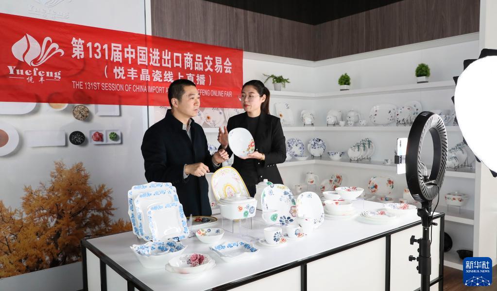 4月15日,第131屆中國進(jìn)出口商品交易會(huì)線上開幕。在江蘇省淮安市洪澤區(qū),一家陶瓷企業(yè)的工作人員在展廳直播介紹產(chǎn)品。新華社發(fā)(趙啟瑞 攝)