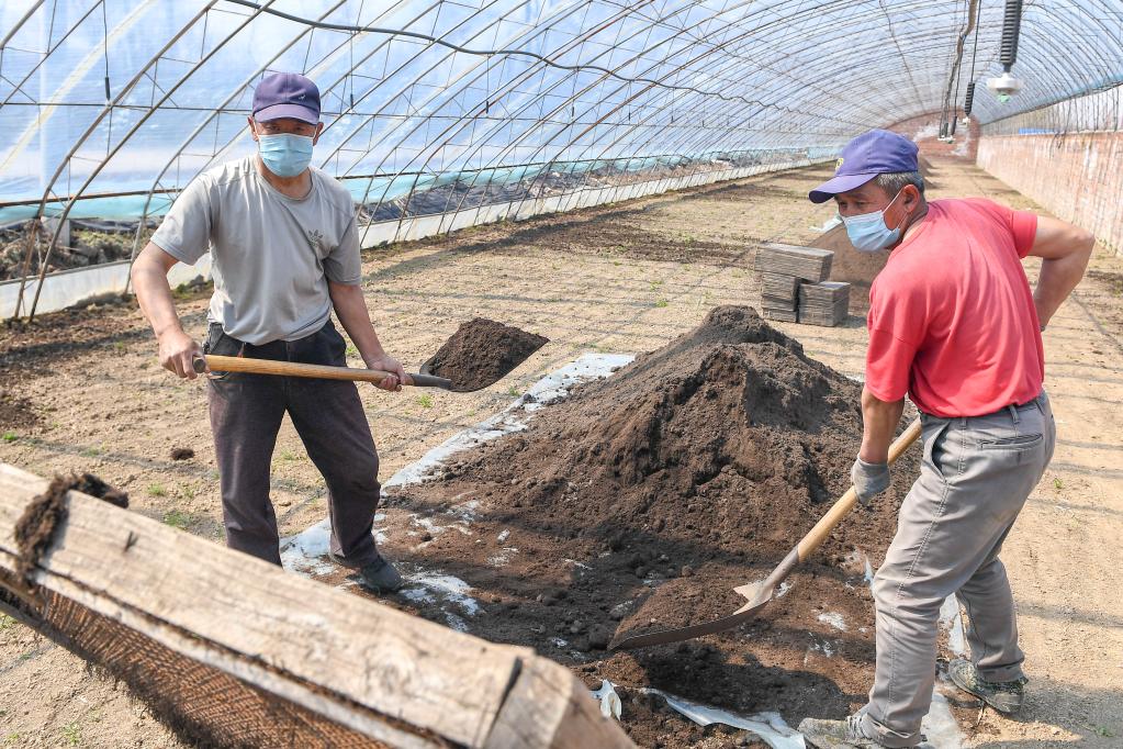 4月15日,在吉林省吉林市龍?zhí)秴^(qū)江北鄉(xiāng)棋盤村,農(nóng)民在大棚內(nèi)忙碌。新華社記者張楠 攝