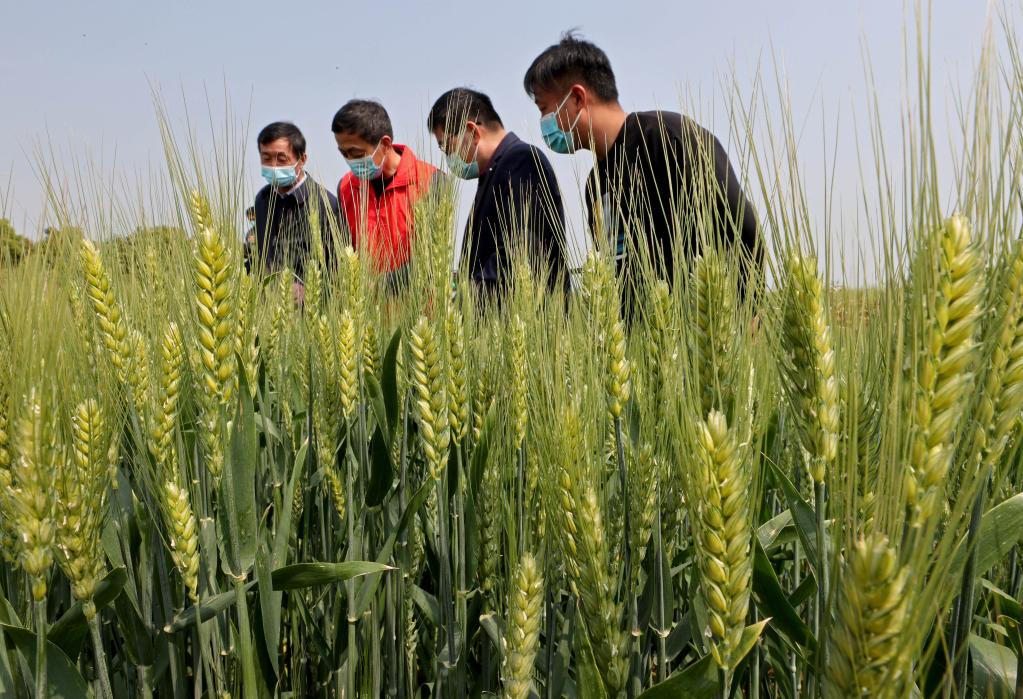 4月19日,在安徽省滁州市全椒縣大墅鎮(zhèn)大墅村,農(nóng)技人員指導(dǎo)種植大戶防治小麥赤霉病。新華社發(fā)