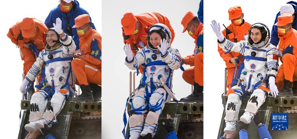 4月16日,神舟十三號(hào)載人飛船返回艙在東風(fēng)著陸場(chǎng)成功著陸。這是航天員翟志剛、王亞平、葉光富(左至右)安全順利出艙(拼版照片)。新華社發(fā)