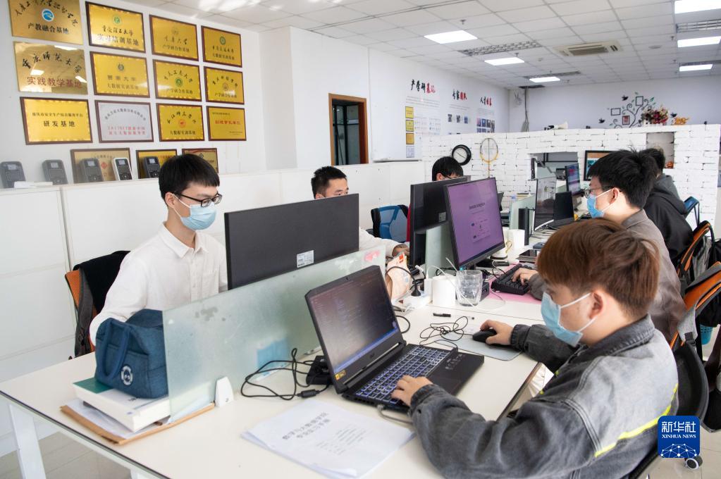 在位于重慶大渡口的“大眾創(chuàng)業(yè)萬(wàn)眾創(chuàng)新示范基地”內(nèi),大學(xué)畢業(yè)生和青年人才在一家名為重慶芝諾的大數(shù)據(jù)公司內(nèi)工作(3月28日攝)。新華社記者 唐奕 攝