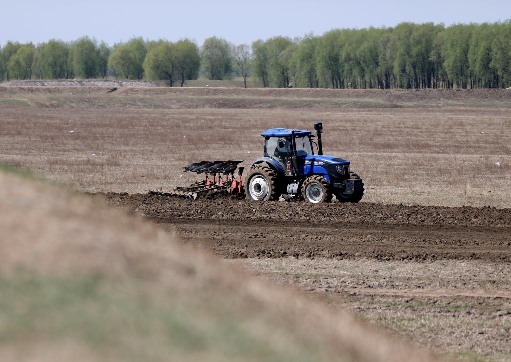 2022年4月22日,在遼寧省臺安縣達牛鎮(zhèn)十四家子村大豆基地,農(nóng)機手駕駛農(nóng)機對農(nóng)田進行翻耕。新華社記者 姚劍鋒 攝