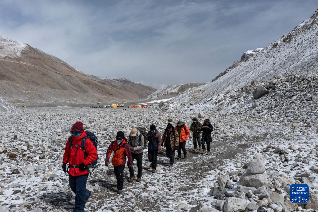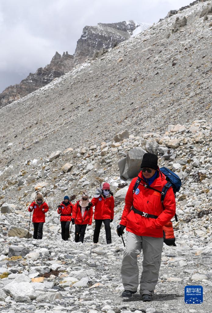 朱彤(右一)和科研人員在珠峰大本營(yíng)和東絨布冰川間徒步穿梭(5月1日攝)。新華社記者 姜帆 攝